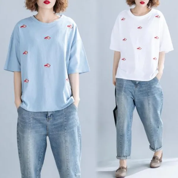 2019 여름 여성 오버핏 티셔츠 2019 새로운 느슨한 대형 면화 돼지 패턴 자수 캐주얼 티셔츠에서 실제 총점 가격 한도 40 위안