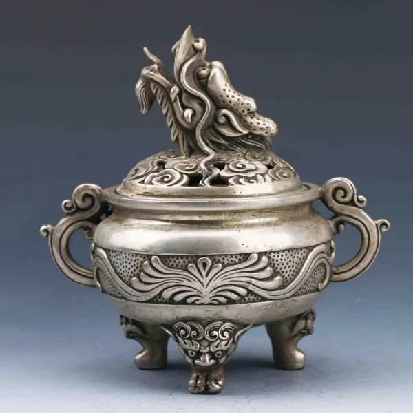소장품 장식 중국 티벳 실버 손으로 조각 한 동물의 향 버너 & 드래곤 헤드 뚜껑 향로 세 다리 삼각대 동상, 1개, 단일