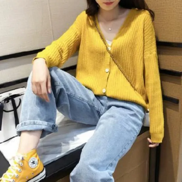 여성 브이넥 가디건 봄 신상품 여성복 니트 카디건 박시 쇼트 탑 레드 나른한 라그란 바람