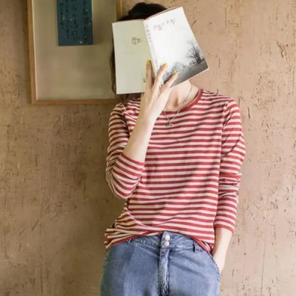 빈티지 레드 스트라이프 면스판 티셔츠 문예긴팔루즈 상의 왼쪽 귀 왼쪽 기슭
