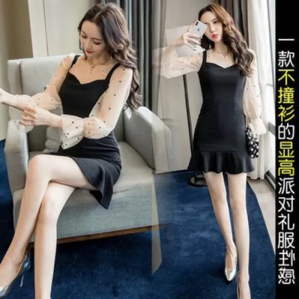 파티복 이브닝 웨딩 드레스 돌잔치 피로연 셀프 프렌치 드레스는 평소 데이트 블랙 긴팔 피쉬의 달콤하고 슬림해 보이는 미니드레스가 고급스럽습니다.