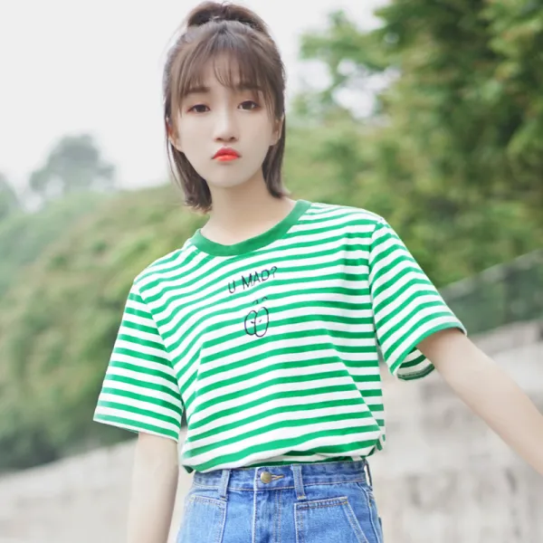 하다맘 박시반팔티 버카치 스위트 그린 반팔티셔츠 여름 학생 와이드 루즈핏 스트라이프 단가라 자수 모체인
