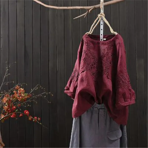 여자 린넨 티셔츠 묵념 레트로 빈티지 자수 반팔 여와이프 면 마 에스닉 여름 마 소재 상의