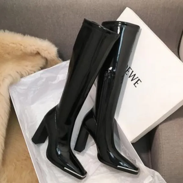 여성 롱 부츠 롱 부츠는 니하이 통굽높이 굽이 굵은 에나멜 힐에 니힐 2020 가을 겨울 메쉬 레드 기사화