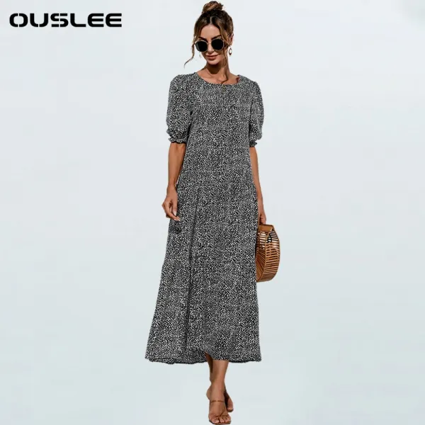 OUSLEE 2021 새로운 우아한 O 목 체크 무늬 드레스 여성 퍼프 슬리브 계층화 된 긴 드레스 여성 캐주얼 느슨한 폴카 도트 맥시 드레스 Femme|Dresses|