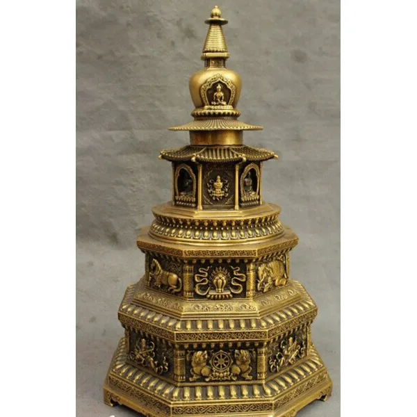 16 티베트 불교 순수한 청동 8 길조 상징 동상 탑 탑 Stupa Tope 세트