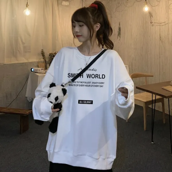 얇은맨투맨 면 여성 트렌드 봄가을 계절 와이드 루즈핏 모자 없음 키치한 화이트 상의 4909054113