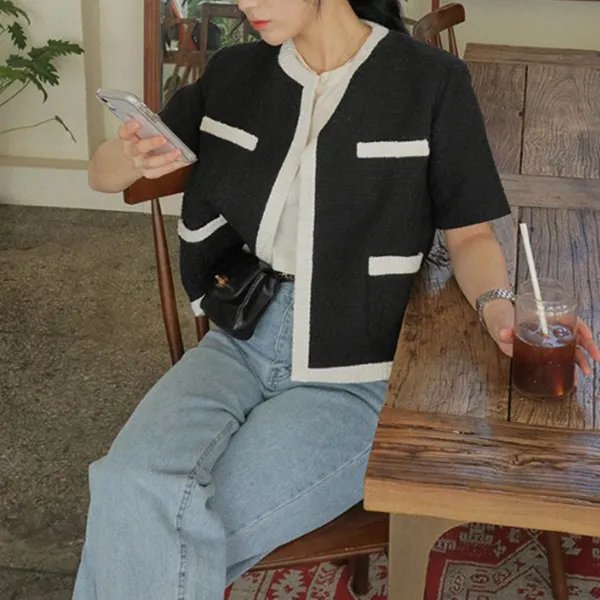 [레티고] 여성 여름 트위드 라인 배색 반팔 자켓